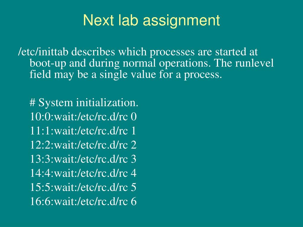 Next lab assignment /etc/inittab describes which processes are started at boot-up and during normal operations. The runlevel field may be a single value for a process. # System initialization. 10:0:wait:/etc/rc.d/rc 0 11:1:wait:/etc/rc.d/rc 1 12:2:wait:/etc/rc.d/rc 2 13:3:wait:/etc/rc.d/rc 3 14:4:wait:/etc/rc.d/rc 4 15:5:wait:/etc/rc.d/rc 5 16:6:wait:/etc/rc.d/rc 6