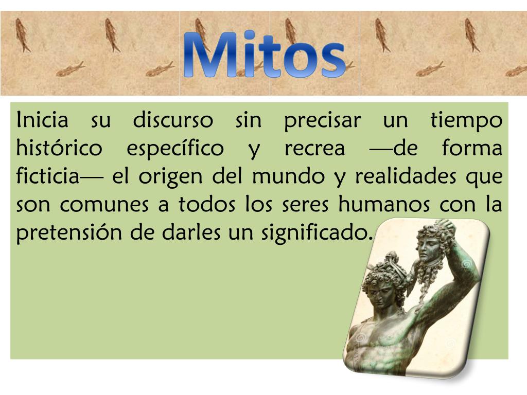 Mitos Inicia su discurso sin precisar un tiempo histórico específico y recrea —de forma ficticia— el origen del mundo y realidades que son comunes a todos los seres humanos con la pretensión de darles un significado.