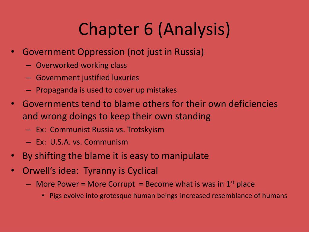Chapter 6 (Analysis) • Government Oppression (not just in Russia) • Overworked working class • Government justified luxuries • Propaganda is used to cover up mistakes • Governments tend to blame others for their own deficiencies and wrong doings to keep their own standing • Ex: Communist Russia vs. Trotskyism • Ex: U.S.A. vs. Communism • By shifting the blame it is easy to manipulate • Orwell’s idea: Tyranny is Cyclical • More Power = More Corrupt = Become what is was in 1st place • Pigs evolve into grotesque human beings-increased resemblance of humans