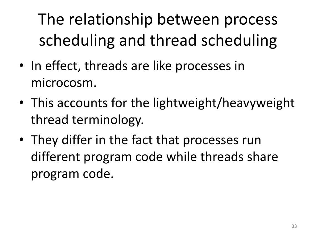The relationship between process scheduling and thread scheduling • In effect, threads are like processes in microcosm. • This accounts for the lightweight/heavyweight thread terminology. • They differ in the fact that processes run different program code while threads share program code.