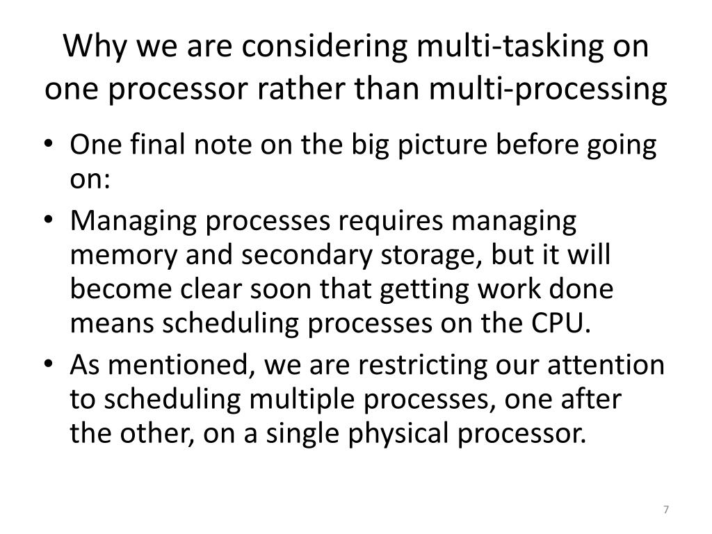 Why we are considering multi-tasking on one processor rather than multi-processing • One final note on the big picture before going on: • Managing processes requires managing memory and secondary storage, but it will become clear soon that getting work done means scheduling processes on the CPU. • As mentioned, we are restricting our attention to scheduling multiple processes, one after the other, on a single physical processor.