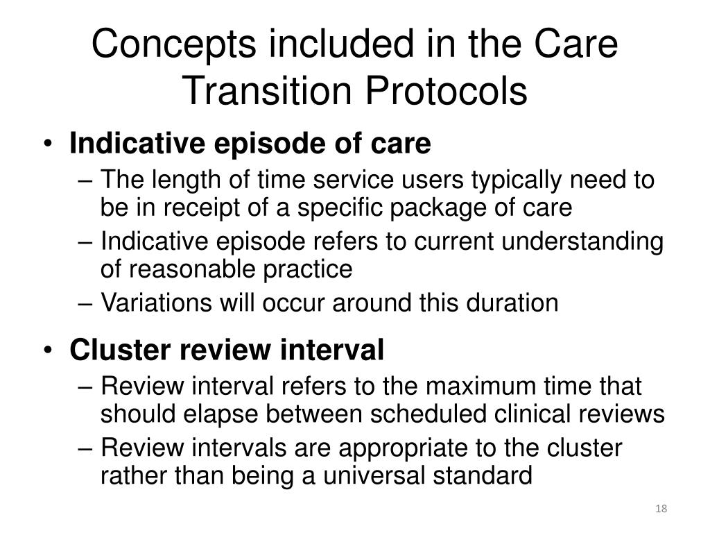 Concepts included in the Care Transition Protocols • Indicative episode of care • The length of time service users typically need to be in receipt of a specific package of care • Indicative episode refers to current understanding of reasonable practice • Variations will occur around this duration • Cluster review interval • Review interval refers to the maximum time that should elapse between scheduled clinical reviews • Review intervals are appropriate to the cluster rather than being a universal standard