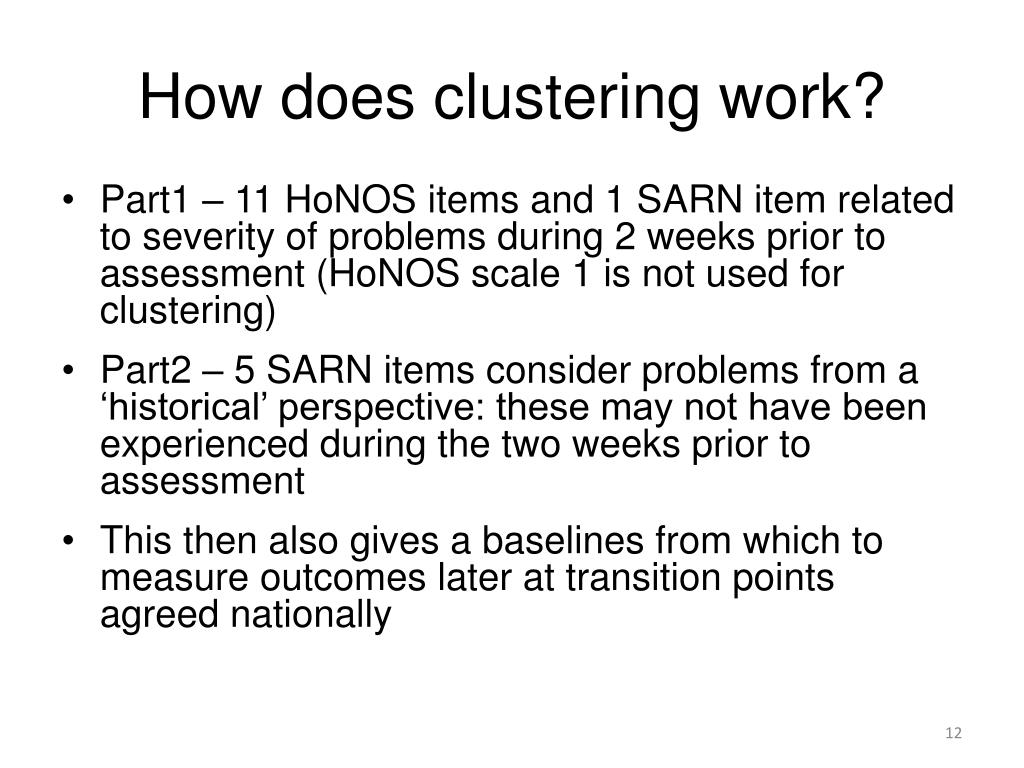 How does clustering work? • Part1 – 11 HoNOS items and 1 SARN item related to severity of problems during 2 weeks prior to assessment (HoNOS scale 1 is not used for clustering) • Part2 – 5 SARN items consider problems from a ‘historical’ perspective: these may not have been experienced during the two weeks prior to assessment • This then also gives a baselines from which to measure outcomes later at transition points agreed nationally