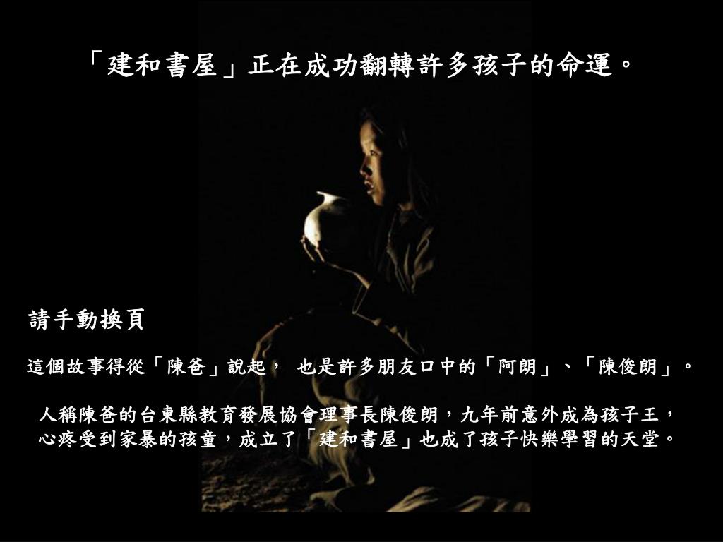 建和書屋的故事. 「建和書屋」正在成功翻轉許多孩子的命運。. 請手動換頁. 這個故事得從「陳爸」說起, 也是許多朋友口中的「阿朗」、「陳俊朗」。. 人稱陳爸的台東縣教育發展協會理事長陳俊朗,九年前意外成為孩子王,心疼受到家暴的孩童,成立了「建和書屋」也成了孩子快樂學習的天堂。. 建和社區長大的陳俊朗,曾經做過業務,也經營過花店、咖啡店等,在生意愈見興隆時,卻發現與妻兒愈見生疏。這種沮喪讓九年前 36 歲的他,毅然舉家回鄉,準備考書記官,希望未來可以和家人有更緊密的家庭生活。