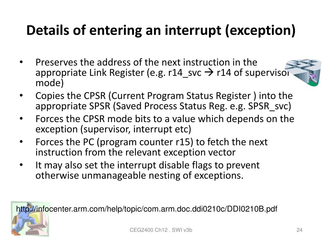 Chapter 12: Software interrupts (SWI) and exceptions. CEG2400 - Microcomputer Systems. [1] ARM7TDMI , Revision: r4p1 , Technical Reference Manual http://infocenter.arm.com/help/topic/com.arm.doc.ddi0210c/DDI0210B.pdf. A brief introduction of. interrupt/exception.