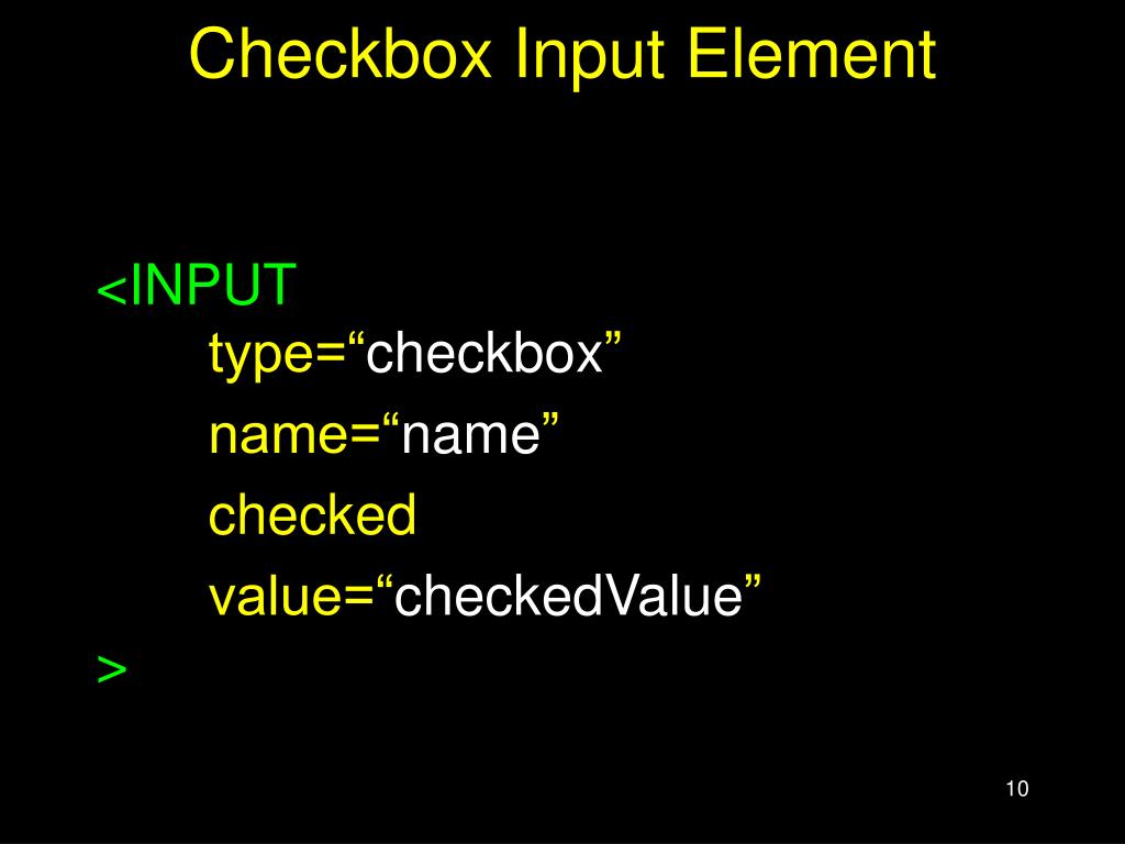 Checkbox Input Element <INPUTtype=“checkbox” name=“name” checked value=“checkedValue”>