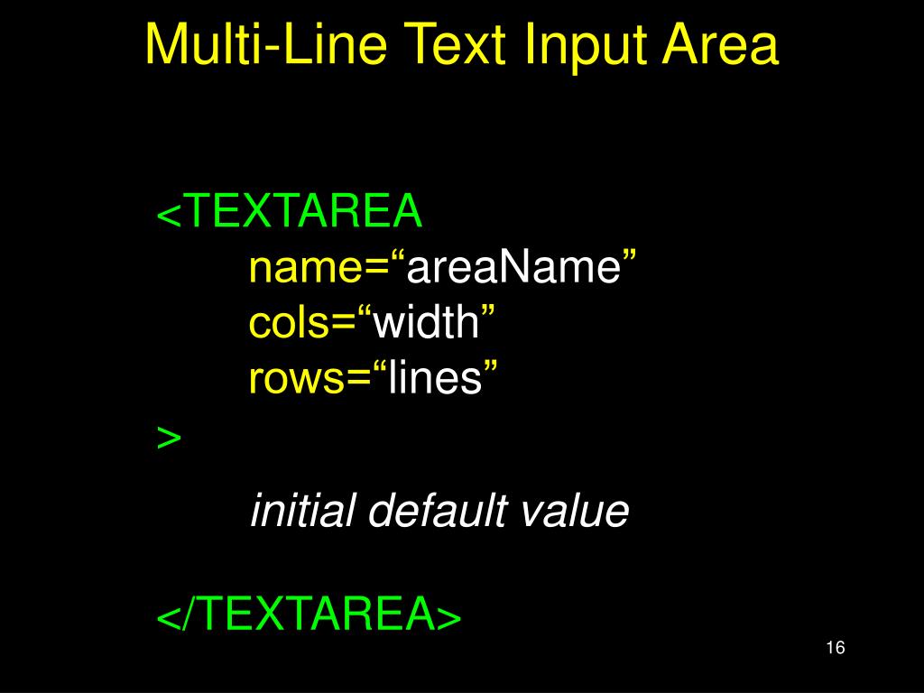 Multi-Line Text Input Area <TEXTAREAname=“areaName”cols=“width”rows=“lines”> initial default value </TEXTAREA>