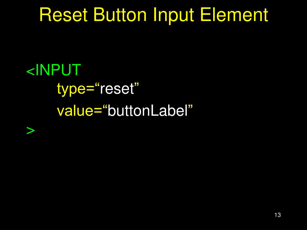 Reset Button Input Element <INPUTtype=“reset” value=“buttonLabel”>
