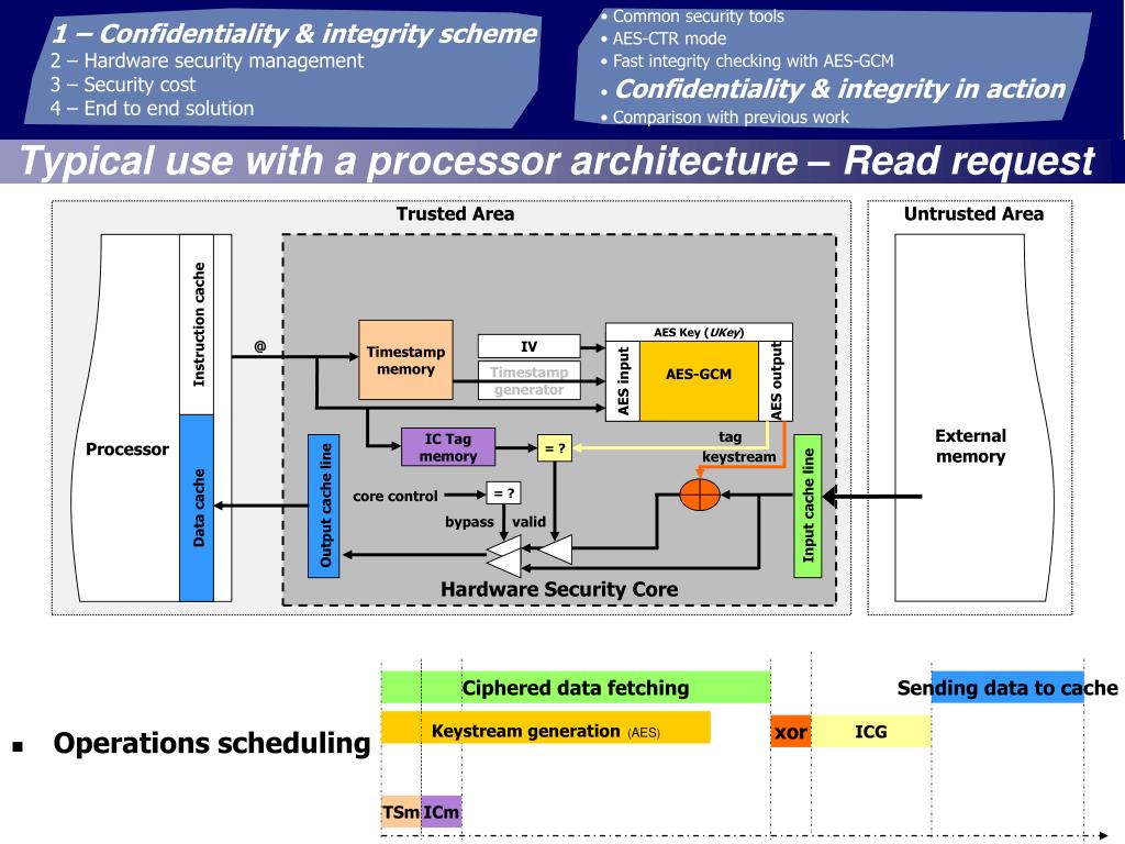 Operations scheduling • Common security tools • AES-CTR mode • Fast integrity checking with AES-GCM • Confidentiality & integrity in action • Comparison with previous work 1 – Confidentiality & integrity scheme 2 – Hardware security management 3 – Security cost 4 – End to end solution Typical use with a processor architecture – Read request Trusted Area Untrusted Area Hardware Security Core Instruction cache Timestamp memory AES Key (UKey) @ IV AES-GCM Timestamp generator AES output AES input Data cache External memory Processor tag IC Tagmemory Output cache line Input cache line = ? keystream core control = ? bypass valid Ciphered data fetching Sending data to cache Keystream generation(AES) xor ICG TSm ICm
