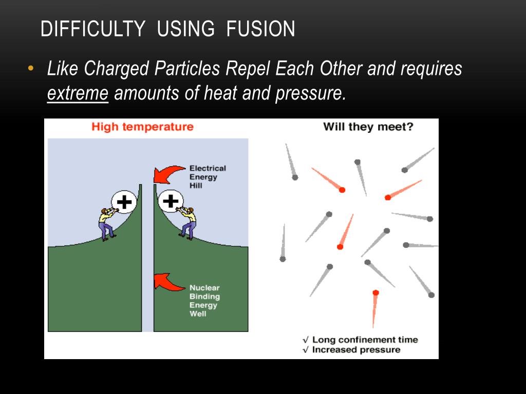 Difficulty USING Fusion • Like Charged Particles Repel Each Other and requires extreme amounts of heat and pressure.