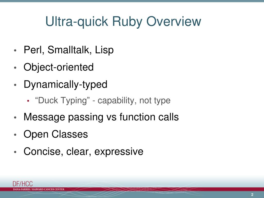 Ultra-quick Ruby Overview • Perl, Smalltalk, Lisp • Object-oriented • Dynamically-typed • “Duck Typing” - capability, not type • Message passing vs function calls • Open Classes • Concise, clear, expressive