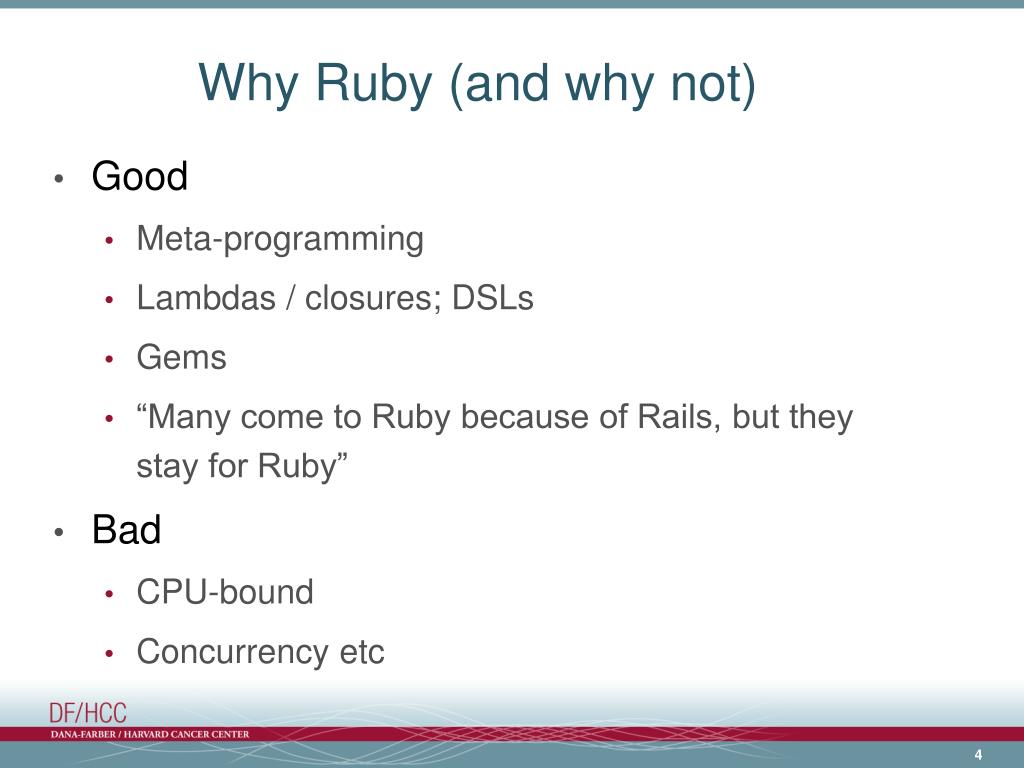 Why Ruby (and why not) • Good • Meta-programming • Lambdas / closures; DSLs • Gems • “Many come to Ruby because of Rails, but they stay for Ruby” • Bad • CPU-bound • Concurrency etc