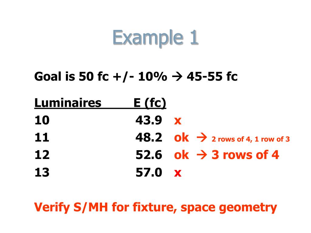 Example 1 Goal is 50 fc +/- 10% 45-55 fc Luminaires E (fc) 10 43.9 x 11 48.2 ok 2 rows of 4, 1 row of 3 12 52.6 ok 3 rows of 4 13 57.0 x Verify S/MH for fixture, space geometry