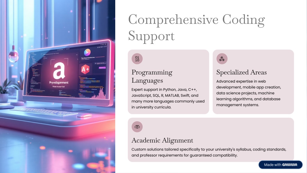 Comprehensive Coding Support Programming Languages Specialized Areas Advanced expertise in web development, mobile app creation, data science projects, machine learning algorithms, and database management systems. Expert support in Python, Java, C++, JavaScript, SQL, R, MATLAB, Swift, and many more languages commonly used in university curricula. Academic Alignment Custom solutions tailored specifically to your university's syllabus, coding standards, and professor requirements for guaranteed compatibility.