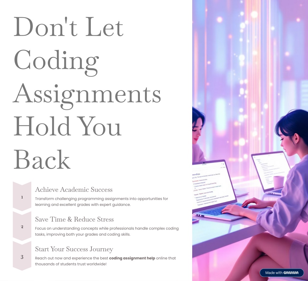Don't Let Coding Assignments Hold You Back Achieve Academic Success 1 Transform challenging programming assignments into opportunities for learning and excellent grades with expert guidance. Save Time & Reduce Stress 2 Focus on understanding concepts while professionals handle complex coding tasks, improving both your grades and coding skills. Start Your Success Journey 3 Reach out now and experience the best coding assignment help online that thousands of students trust worldwide!