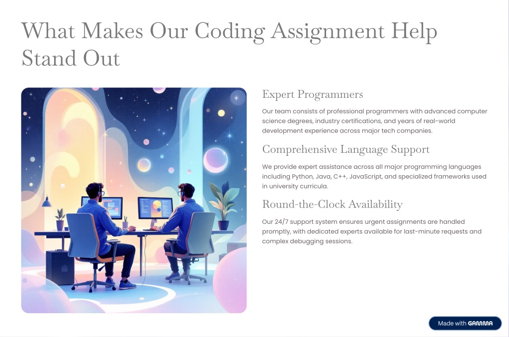 What Makes Our Coding Assignment Help Stand Out Expert Programmers Our team consists of professional programmers with advanced computer science degrees, industry certifications, and years of real-world development experience across major tech companies. Comprehensive Language Support We provide expert assistance across all major programming languages including Python, Java, C++, JavaScript, and specialized frameworks used in university curricula. Round-the-Clock Availability Our 24/7 support system ensures urgent assignments are handled promptly, with dedicated experts available for last-minute requests and complex debugging sessions.