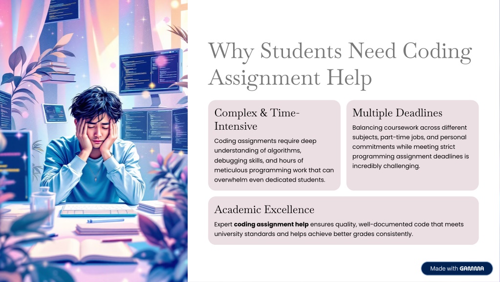Why Students Need Coding Assignment Help Complex & Time- Intensive Multiple Deadlines Balancing coursework across different subjects, part-time jobs, and personal commitments while meeting strict programming assignment deadlines is incredibly challenging. Coding assignments require deep understanding of algorithms, debugging skills, and hours of meticulous programming work that can overwhelm even dedicated students. Academic Excellence Expert coding assignment help ensures quality, well-documented code that meets university standards and helps achieve better grades consistently.