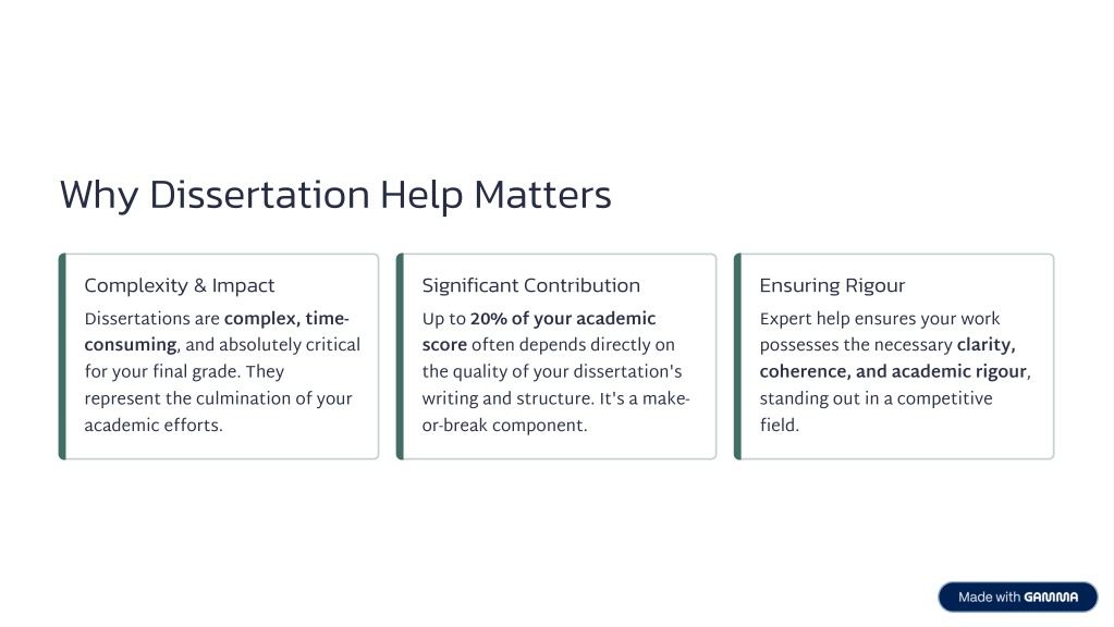 Why Dissertation Help Matters Complexity & Impact Dissertations are complex, time- consuming, and absolutely critical for your final grade. They represent the culmination of your academic efforts. Significant Contribution Up to 20% of your academic score often depends directly on the quality of your dissertation's writing and structure. It's a make- or-break component. Ensuring Rigour Expert help ensures your work possesses the necessary clarity, coherence, and academic rigour, standing out in a competitive field.