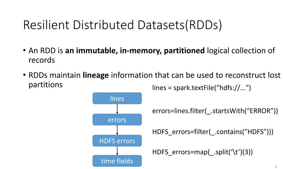 Resilient Distributed Datasets(RDDs) • An RDD is an immutable, in-memory, partitioned logical collection of records • RDDs maintain lineage information that can be used to reconstruct lost partitions lines = spark.textFile("hdfs://...") lines errors=lines.filter(_.startsWith(“ERROR”)) errors HDFS_errors=filter(_.contains(“HDFS”))) HDFS errors HDFS_errors=map(_.split(‘\t’)(3)) time fields