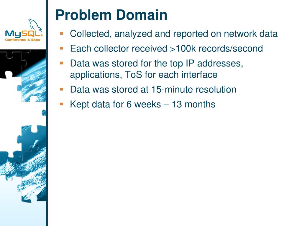 Problem Domain • Collected, analyzed and reported on network data • Each collector received >100k records/second • Data was stored for the top IP addresses, applications, ToS for each interface • Data was stored at 15-minute resolution • Kept data for 6 weeks – 13 months