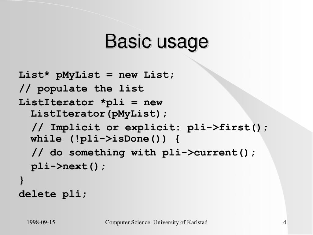 Basic usage List* pMyList = new List; // populate the list ListIterator *pli = new ListIterator(pMyList); // Implicit or explicit: pli->first();while (!pli->isDone()) { // do something with pli->current(); pli->next(); } delete pli; Computer Science, University of Karlstad