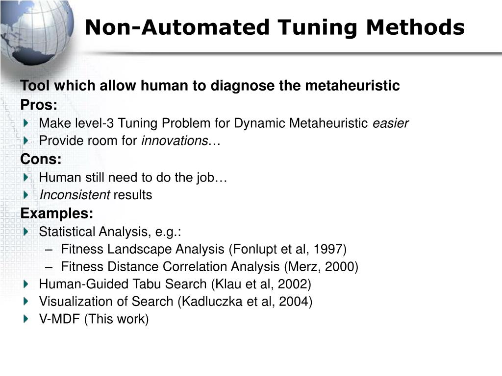 Non-Automated Tuning Methods Tool which allow human to diagnose the metaheuristic Pros: • Make level-3 Tuning Problem for Dynamic Metaheuristic easier • Provide room for innovations… Cons: • Human still need to do the job… • Inconsistent results Examples: • Statistical Analysis, e.g.: • Fitness Landscape Analysis (Fonlupt et al, 1997) • Fitness Distance Correlation Analysis (Merz, 2000) • Human-Guided Tabu Search (Klau et al, 2002) • Visualization of Search (Kadluczka et al, 2004) • V-MDF (This work)