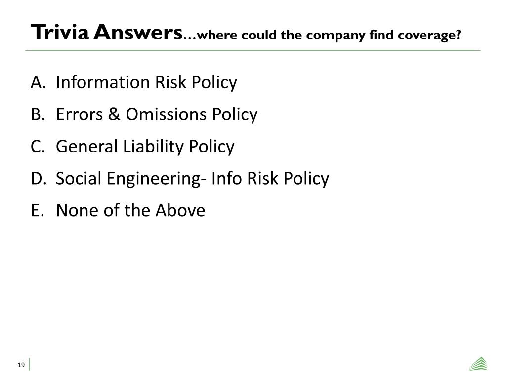 Trivia Answers…where could the company find coverage? • Information Risk Policy • Errors & Omissions Policy • General Liability Policy • Social Engineering- Info Risk Policy • None of the Above 19
