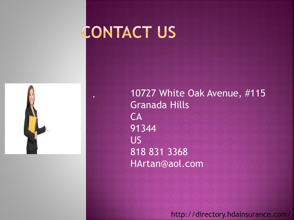 Contact Us 10727 White Oak Avenue, #115 Granada Hills CA 91344 US 818 831 3368 HArtan@aol.com . http://directory.hdainsurance.com/