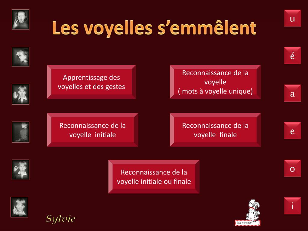 u Les voyelles s’emmêlent é Apprentissage des voyelles et des gestes Reconnaissance de la voyelle ( mots à voyelle unique) a Reconnaissance de la voyelle initiale Reconnaissance de la voyelle finale e o Reconnaissance de la voyelle initiale ou finale i
