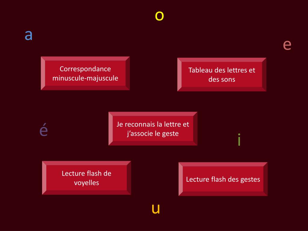 o a e Correspondance minuscule-majuscule Tableau des lettres et des sons Je reconnais la lettre et j’associe le geste é i Lecture flash de voyelles Lecture flash des gestes n