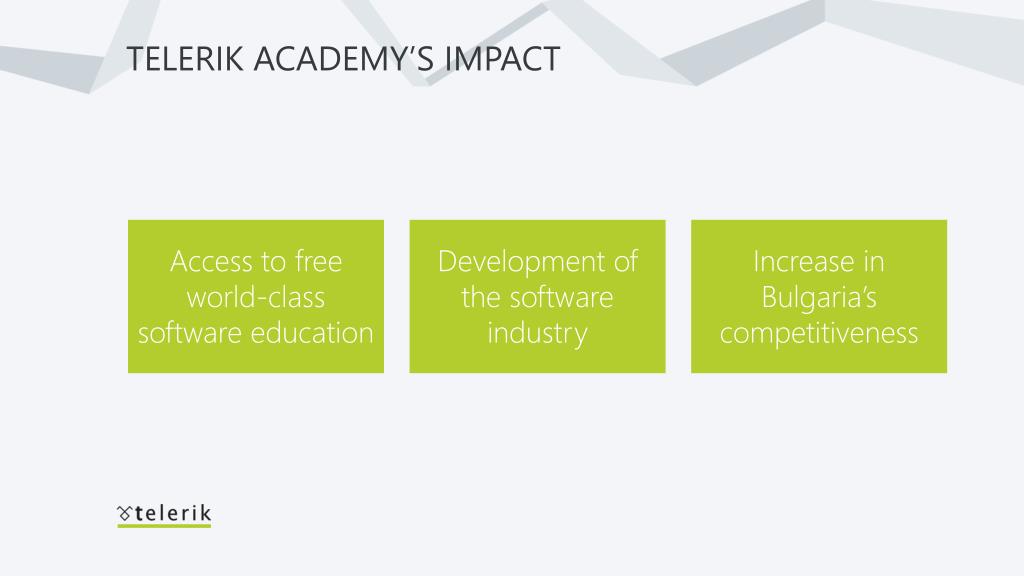 Train talent for the entire software industry Telerik hires only 10% of all Telerik Academy graduates and about 3%of all Academy students.
