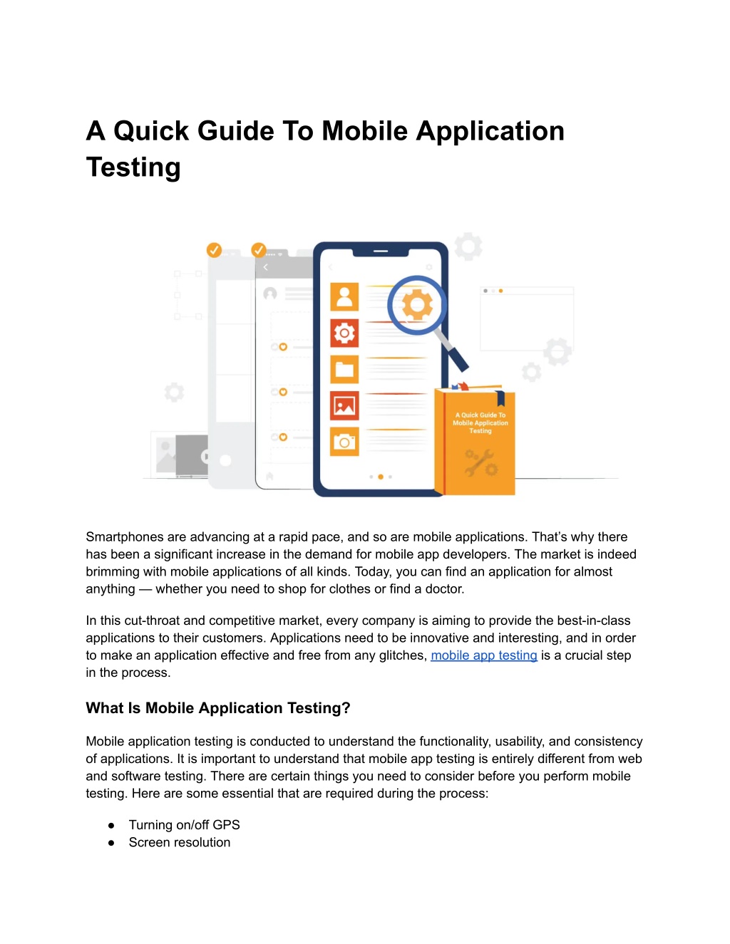 A Quick Guide To Mobile Application Testing Smartphones are advancing at a rapid pace, and so are mobile applications. That’s why there has been a significant increase in the demand for mobile app developers. The market is indeed brimming with mobile applications of all kinds. Today, you can find an application for almost anything — whether you need to shop for clothes or find a doctor. In this cut-throat and competitive market, every company is aiming to provide the best-in-class applications to their customers. Applications need to be innovative and interesting, and in order to make an application effective and free from any glitches, mobile app testing is a crucial step in the process. What Is Mobile Application Testing? Mobile application testing is conducted to understand the functionality, usability, and consistency of applications. It is important to understand that mobile app testing is entirely different from web and software testing. There are certain things you need to consider before you perform mobile testing. Here are some essential that are required during the process: ● Turning on/off GPS ● Screen resolution