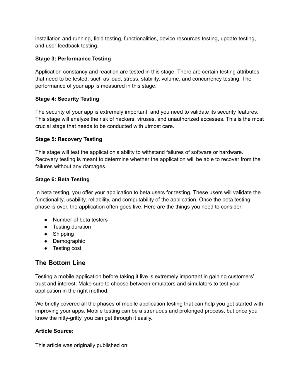 installation and running, field testing, functionalities, device resources testing, update testing, and user feedback testing. Stage 3: Performance Testing Application constancy and reaction are tested in this stage. There are certain testing attributes that need to be tested, such as load, stress, stability, volume, and concurrency testing. The performance of your app is measured in this stage. Stage 4: Security Testing The security of your app is extremely important, and you need to validate its security features. This stage will analyze the risk of hackers, viruses, and unauthorized accesses. This is the most crucial stage that needs to be conducted with utmost care. Stage 5: Recovery Testing This stage will test the application’s ability to withstand failures of software or hardware. Recovery testing is meant to determine whether the application will be able to recover from the failures without any damages. Stage 6: Beta Testing In beta testing, you offer your application to beta users for testing. These users will validate the functionality, usability, reliability, and computability of the application. Once the beta testing phase is over, the application often goes live. Here are the things you need to consider: ● Number of beta testers ● Testing duration ● Shipping ● Demographic ● Testing cost The Bottom Line Testing a mobile application before taking it live is extremely important in gaining customers’ trust and interest. Make sure to choose between emulators and simulators to test your application in the right method. We briefly covered all the phases of mobile application testing that can help you get started with improving your apps. Mobile testing can be a strenuous and prolonged process, but once you know the nitty-gritty, you can get through it easily. Article Source: This article was originally published on: