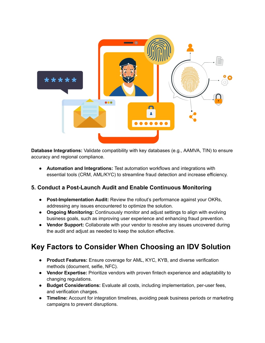 Database Integrations: Validate compatibility with key databases (e.g., AAMVA, TIN) to ensure accuracy and regional compliance. ● Automation and Integrations: Test automation workflows and integrations with essential tools (CRM, AML/KYC) to streamline fraud detection and increase efficiency. 5. Conduct a Post-Launch Audit and Enable Continuous Monitoring ● Post-Implementation Audit: Review the rollout’s performance against your OKRs, addressing any issues encountered to optimize the solution. ● Ongoing Monitoring: Continuously monitor and adjust settings to align with evolving business goals, such as improving user experience and enhancing fraud prevention. ● Vendor Support: Collaborate with your vendor to resolve any issues uncovered during the audit and adjust as needed to keep the solution effective. Key Factors to Consider When Choosing an IDV Solution ● Product Features: Ensure coverage for AML, KYC, KYB, and diverse verification methods (document, selfie, NFC). ● Vendor Expertise: Prioritize vendors with proven fintech experience and adaptability to changing regulations. ● Budget Considerations: Evaluate all costs, including implementation, per-user fees, and verification charges. ● Timeline: Account for integration timelines, avoiding peak business periods or marketing campaigns to prevent disruptions.