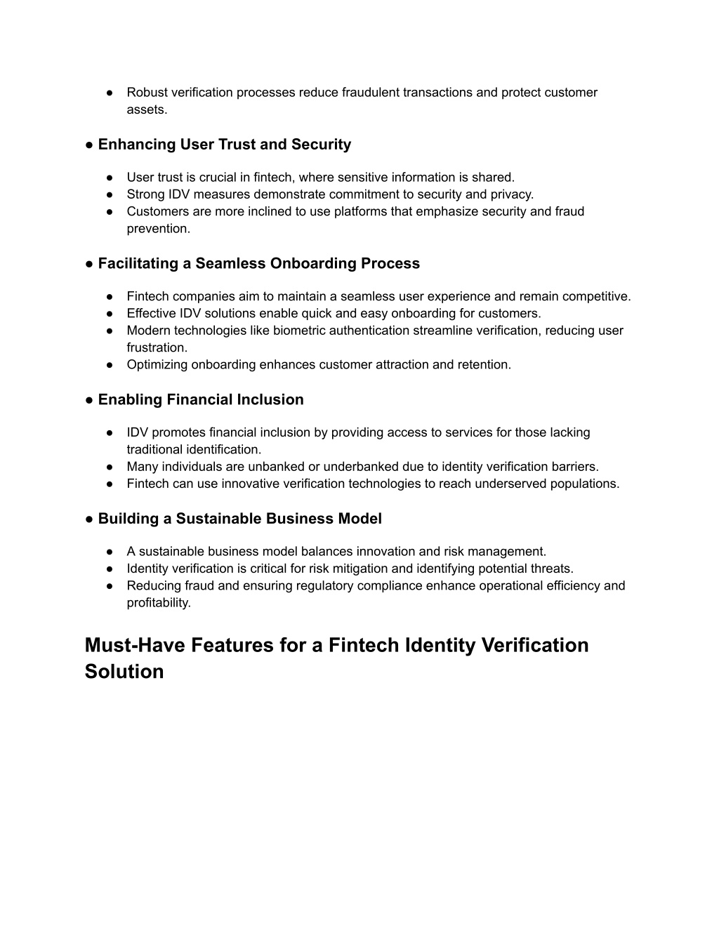 ● Robust verification processes reduce fraudulent transactions and protect customer assets. ● Enhancing User Trust and Security ● User trust is crucial in fintech, where sensitive information is shared. ● Strong IDV measures demonstrate commitment to security and privacy. ● Customers are more inclined to use platforms that emphasize security and fraud prevention. ● Facilitating a Seamless Onboarding Process ● Fintech companies aim to maintain a seamless user experience and remain competitive. ● Effective IDV solutions enable quick and easy onboarding for customers. ● Modern technologies like biometric authentication streamline verification, reducing user frustration. ● Optimizing onboarding enhances customer attraction and retention. ● Enabling Financial Inclusion ● IDV promotes financial inclusion by providing access to services for those lacking traditional identification. ● Many individuals are unbanked or underbanked due to identity verification barriers. ● Fintech can use innovative verification technologies to reach underserved populations. ● Building a Sustainable Business Model ● A sustainable business model balances innovation and risk management. ● Identity verification is critical for risk mitigation and identifying potential threats. ● Reducing fraud and ensuring regulatory compliance enhance operational efficiency and profitability. Must-Have Features for a Fintech Identity Verification Solution