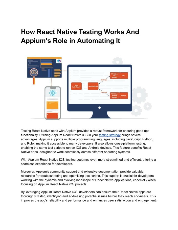 How React Native Testing Works And Appium's Role in Automating It Testing React Native apps with Appium provides a robust framework for ensuring good app functionality. Utilizing Appium React Native iOS in your testing strategy brings several advantages. Appium supports multiple programming languages, including JavaScript, Python, and Ruby, making it accessible to many developers. It also allows cross-platform testing, enabling the same test script to run on iOS and Android devices. This feature benefits React Native apps, designed to work seamlessly across different operating systems. With Appium React Native iOS, testing becomes even more streamlined and efficient, offering a seamless experience for developers. Moreover, Appium's community support and extensive documentation provide valuable resources for troubleshooting and optimizing test scripts. This support is crucial for developers working with the dynamic and evolving landscape of React Native applications, especially when focusing on Appium React Native iOS projects. By leveraging Appium React Native iOS, developers can ensure their React Native apps are thoroughly tested, identifying and addressing potential issues before they reach end-users. This improves the app's reliability and performance and enhances user satisfaction and engagement.
