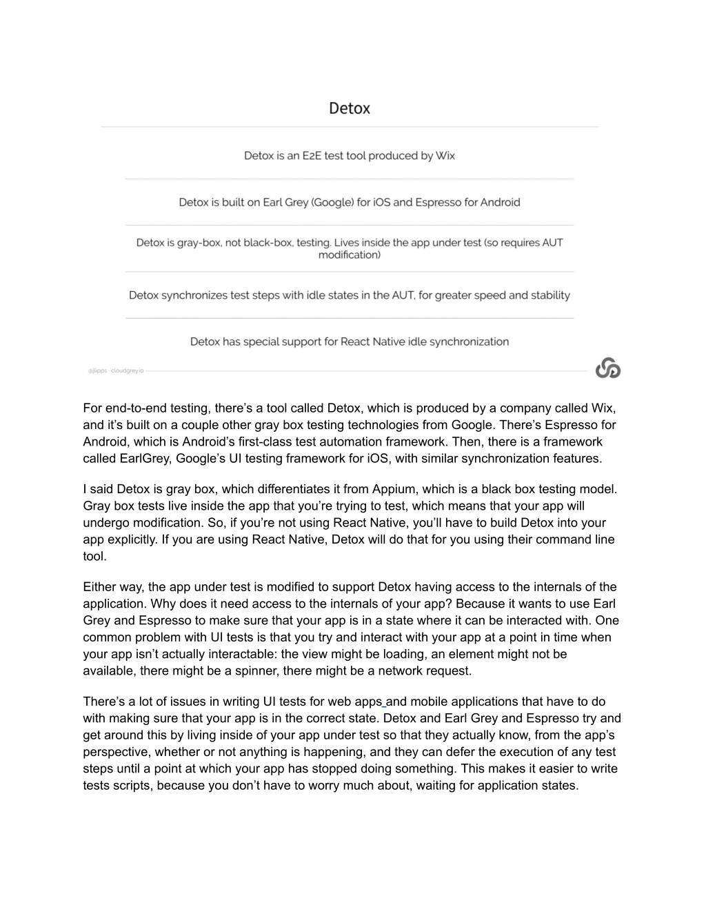 For end-to-end testing, there’s a tool called Detox, which is produced by a company called Wix, and it’s built on a couple other gray box testing technologies from Google. There’s Espresso for Android, which is Android’s first-class test automation framework. Then, there is a framework called EarlGrey, Google’s UI testing framework for iOS, with similar synchronization features. I said Detox is gray box, which differentiates it from Appium, which is a black box testing model. Gray box tests live inside the app that you’re trying to test, which means that your app will undergo modification. So, if you’re not using React Native, you’ll have to build Detox into your app explicitly. If you are using React Native, Detox will do that for you using their command line tool. Either way, the app under test is modified to support Detox having access to the internals of the application. Why does it need access to the internals of your app? Because it wants to use Earl Grey and Espresso to make sure that your app is in a state where it can be interacted with. One common problem with UI tests is that you try and interact with your app at a point in time when your app isn’t actually interactable: the view might be loading, an element might not be available, there might be a spinner, there might be a network request. There’s a lot of issues in writing UI tests for web appsand mobile applications that have to do with making sure that your app is in the correct state. Detox and Earl Grey and Espresso try and get around this by living inside of your app under test so that they actually know, from the app’s perspective, whether or not anything is happening, and they can defer the execution of any test steps until a point at which your app has stopped doing something. This makes it easier to write tests scripts, because you don’t have to worry much about, waiting for application states.