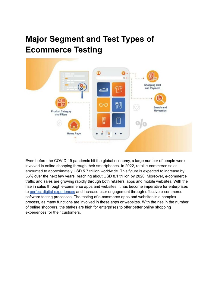 Major Segment and Test Types of Ecommerce Testing Even before the COVID-19 pandemic hit the global economy, a large number of people were involved in online shopping through their smartphones. In 2022, retail e-commerce sales amounted to approximately USD 5.7 trillion worldwide. This figure is expected to increase by 56% over the next few years, reaching about USD 8.1 trillion by 2026. Moreover, e-commerce traffic and sales are growing rapidly through both retailers’ apps and mobile websites. With the rise in sales through e-commerce apps and websites, it has become imperative for enterprises to perfect digital experiences and increase user engagement through effective e-commerce software testing processes. The testing of e-commerce apps and websites is a complex process, as many functions are involved in these apps or websites. With the rise in the number of online shoppers, the stakes are high for enterprises to offer better online shopping experiences for their customers.