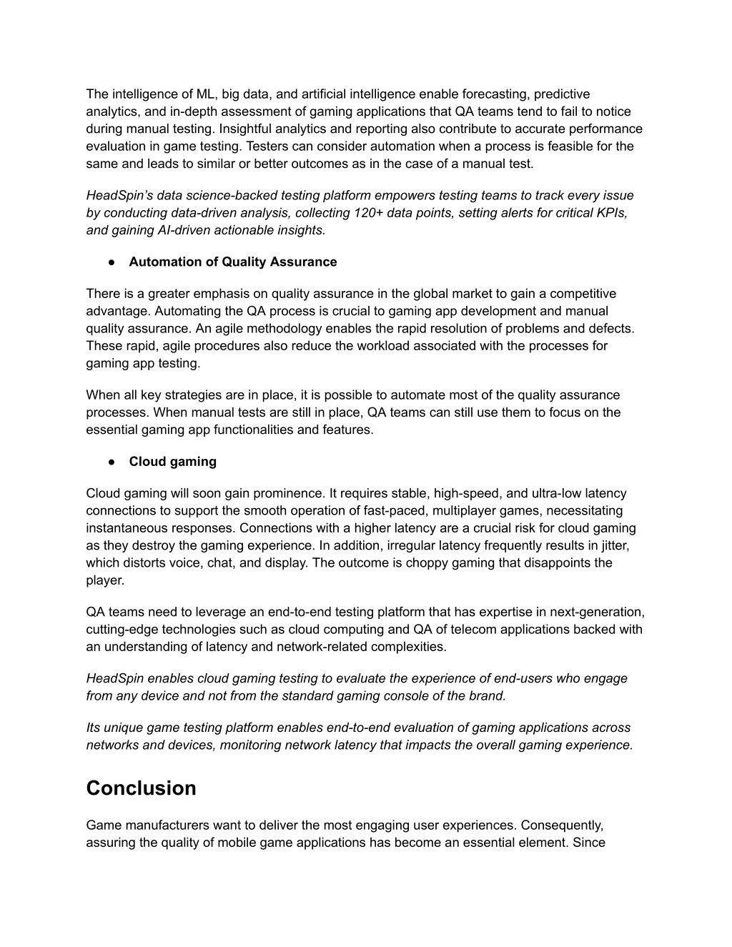 The intelligence of ML, big data, and artificial intelligence enable forecasting, predictive analytics, and in-depth assessment of gaming applications that QA teams tend to fail to notice during manual testing. Insightful analytics and reporting also contribute to accurate performance evaluation in game testing. Testers can consider automation when a process is feasible for the same and leads to similar or better outcomes as in the case of a manual test. HeadSpin’s data science-backed testing platform empowers testing teams to track every issue by conducting data-driven analysis, collecting 120+ data points, setting alerts for critical KPIs, and gaining AI-driven actionable insights. ● Automation of Quality Assurance There is a greater emphasis on quality assurance in the global market to gain a competitive advantage. Automating the QA process is crucial to gaming app development and manual quality assurance. An agile methodology enables the rapid resolution of problems and defects. These rapid, agile procedures also reduce the workload associated with the processes for gaming app testing. When all key strategies are in place, it is possible to automate most of the quality assurance processes. When manual tests are still in place, QA teams can still use them to focus on the essential gaming app functionalities and features. ● Cloud gaming Cloud gaming will soon gain prominence. It requires stable, high-speed, and ultra-low latency connections to support the smooth operation of fast-paced, multiplayer games, necessitating instantaneous responses. Connections with a higher latency are a crucial risk for cloud gaming as they destroy the gaming experience. In addition, irregular latency frequently results in jitter, which distorts voice, chat, and display. The outcome is choppy gaming that disappoints the player. QA teams need to leverage an end-to-end testing platform that has expertise in next-generation, cutting-edge technologies such as cloud computing and QA of telecom applications backed with an understanding of latency and network-related complexities. HeadSpin enables cloud gaming testing to evaluate the experience of end-users who engage from any device and not from the standard gaming console of the brand. Its unique game testing platform enables end-to-end evaluation of gaming applications across networks and devices, monitoring network latency that impacts the overall gaming experience. Conclusion Game manufacturers want to deliver the most engaging user experiences. Consequently, assuring the quality of mobile game applications has become an essential element. Since