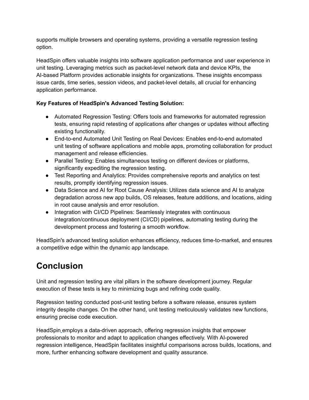 supports multiple browsers and operating systems, providing a versatile regression testing option. HeadSpin offers valuable insights into software application performance and user experience in unit testing. Leveraging metrics such as packet-level network data and device KPIs, the AI-based Platform provides actionable insights for organizations. These insights encompass issue cards, time series, session videos, and packet-level details, all crucial for enhancing application performance. Key Features of HeadSpin's Advanced Testing Solution: ● Automated Regression Testing: Offers tools and frameworks for automated regression tests, ensuring rapid retesting of applications after changes or updates without affecting existing functionality. ● End-to-end Automated Unit Testing on Real Devices: Enables end-to-end automated unit testing of software applications and mobile apps, promoting collaboration for product management and release efficiencies. ● Parallel Testing: Enables simultaneous testing on different devices or platforms, significantly expediting the regression testing. ● Test Reporting and Analytics: Provides comprehensive reports and analytics on test results, promptly identifying regression issues. ● Data Science and AI for Root Cause Analysis: Utilizes data science and AI to analyze degradation across new app builds, OS releases, feature additions, and locations, aiding in root cause analysis and error resolution. ● Integration with CI/CD Pipelines: Seamlessly integrates with continuous integration/continuous deployment (CI/CD) pipelines, automating testing during the development process and fostering a smooth workflow. HeadSpin's advanced testing solution enhances efficiency, reduces time-to-market, and ensures a competitive edge within the dynamic app landscape. Conclusion Unit and regression testing are vital pillars in the software development journey. Regular execution of these tests is key to minimizing bugs and refining code quality. Regression testing conducted post-unit testing before a software release, ensures system integrity despite changes. On the other hand, unit testing meticulously validates new functions, ensuring precise code execution. HeadSpinemploys a data-driven approach, offering regression insights that empower professionals to monitor and adapt to application changes effectively. With AI-powered regression intelligence, HeadSpin facilitates insightful comparisons across builds, locations, and more, further enhancing software development and quality assurance.