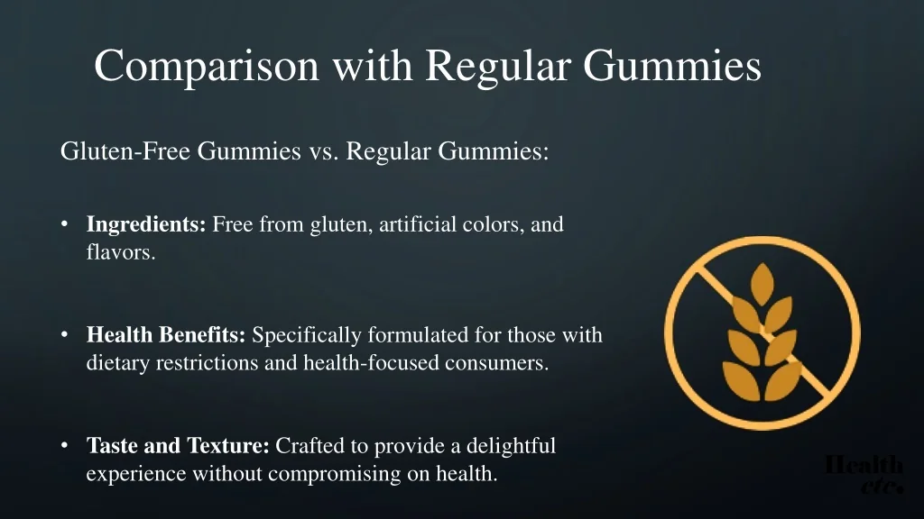 Comparison with Regular Gummies Gluten-Free Gummies vs. Regular Gummies: • Ingredients: Free from gluten, artificial colors, and flavors. • Health Benefits: Specifically formulated for those with dietary restrictions and health-focused consumers. • Taste and Texture: Crafted to provide a delightful experience without compromising on health.