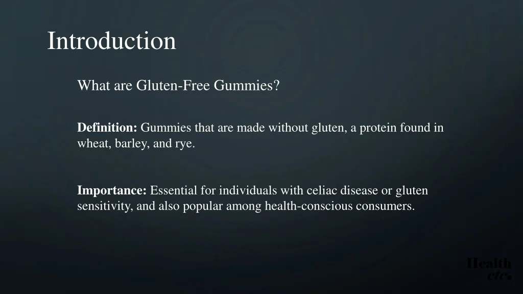 Introduction What are Gluten-Free Gummies? Definition: Gummies that are made without gluten, a protein found in wheat, barley, and rye. Importance: Essential for individuals with celiac disease or gluten sensitivity, and also popular among health-conscious consumers.
