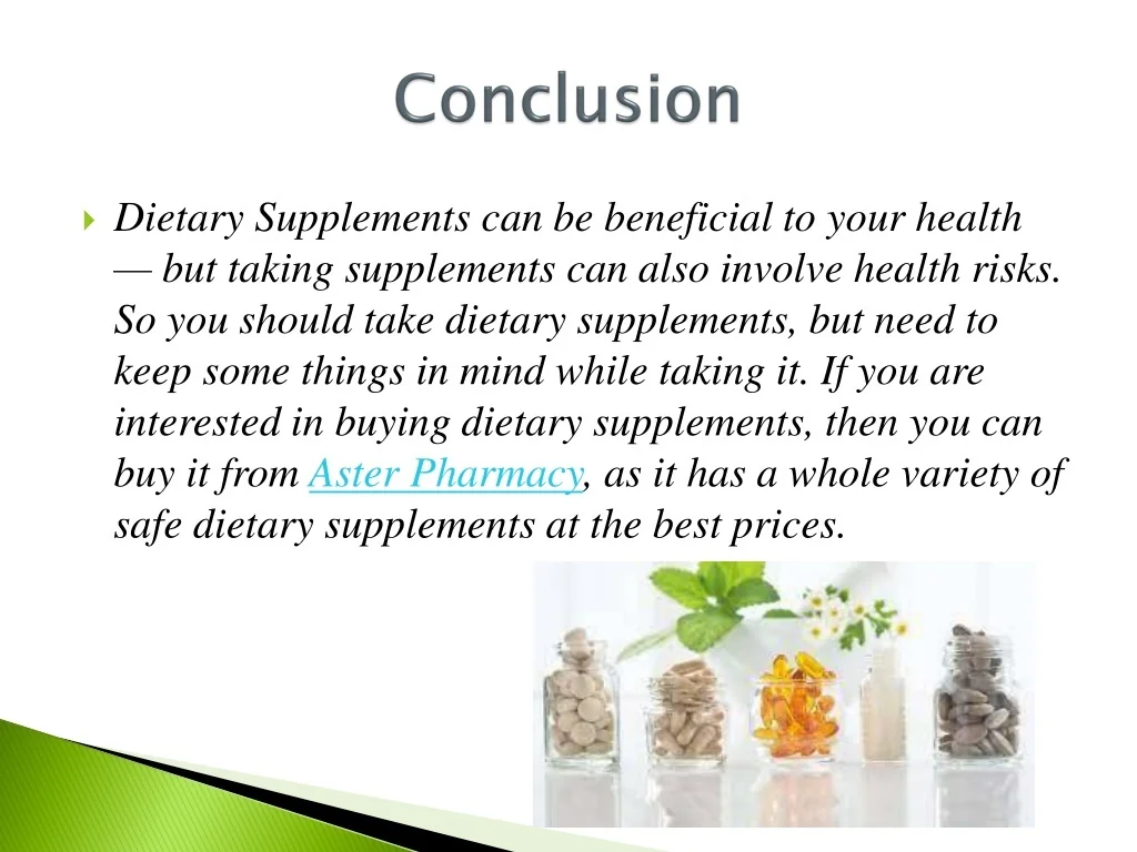 Conclusion • Dietary Supplements can be beneficial to your health — but taking supplements can also involve health risks. So you should take dietary supplements, but need to keep some things in mind while taking it. If you are interested in buying dietary supplements, then you can buy it from Aster Pharmacy, as it has a whole variety of safe dietary supplements at the best prices.