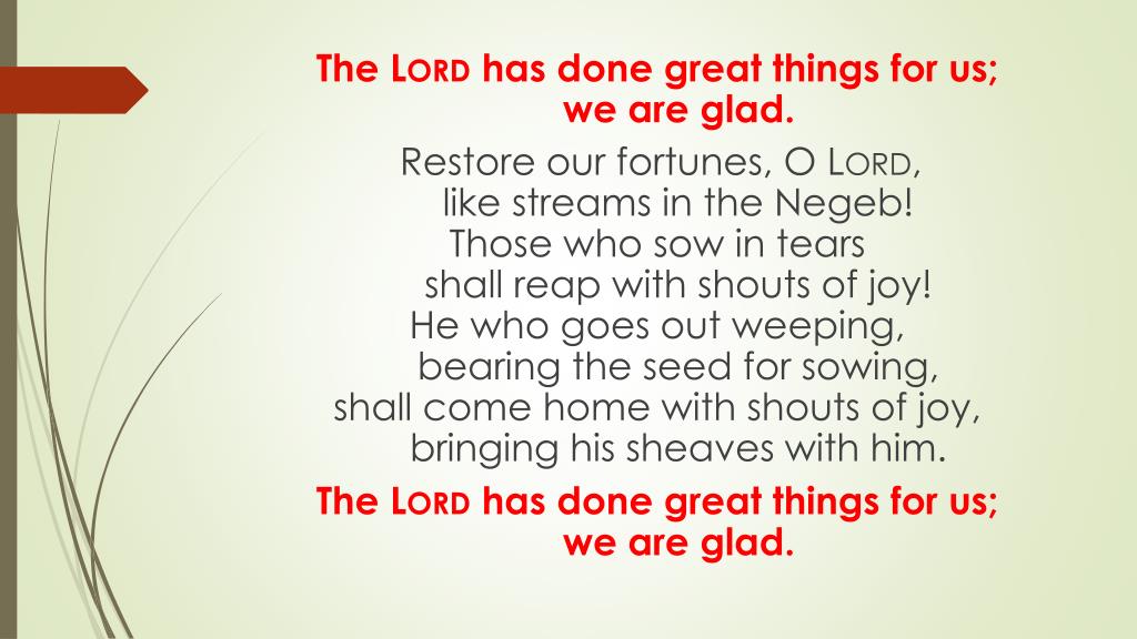 The Lord has done great things for us; we are glad. Restore our fortunes, O Lord, like streams in the Negeb!Those who sow in tears shall reap with shouts of joy!He who goes out weeping, bearing the seed for sowing,shall come home with shouts of joy, bringing his sheaves with him. The Lord has done great things for us; we are glad.