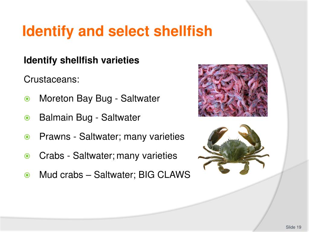 Identify and select shellfish Identify shellfish varieties Crustaceans: • Moreton Bay Bug - Saltwater • Balmain Bug - Saltwater • Prawns - Saltwater; many varieties • Crabs - Saltwater; many varieties • Mud crabs – Saltwater; BIG CLAWS