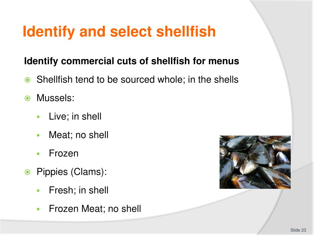 Identify and select shellfish Identify commercial cuts of shellfish for menus • Shellfish tend to be sourced whole; in the shells • Mussels: • Live; in shell • Meat; no shell • Frozen • Pippies (Clams): • Fresh; in shell • Frozen Meat; no shell