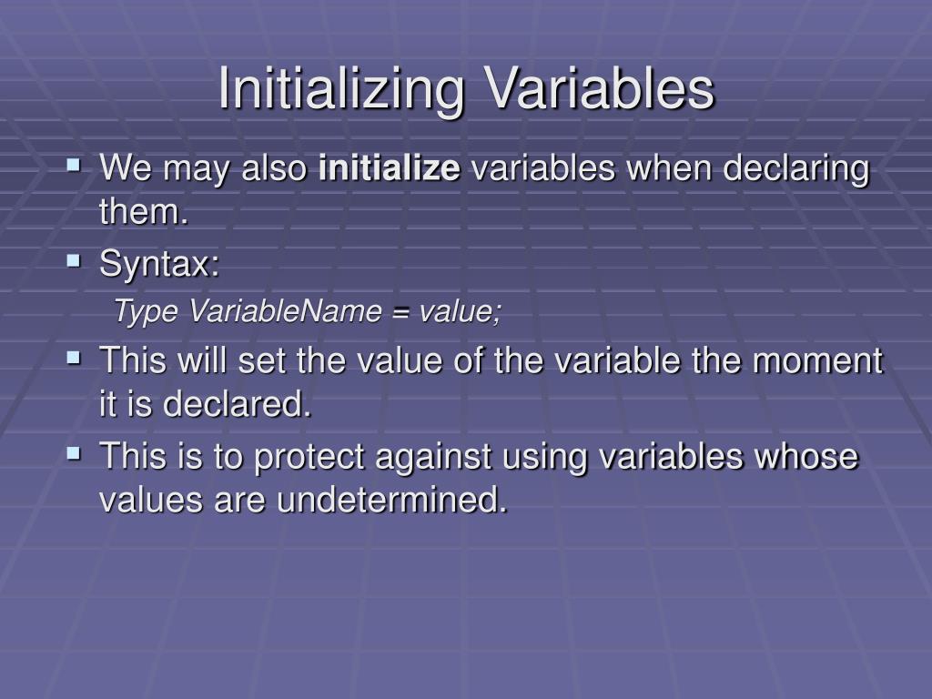 Initializing Variables • We may also initialize variables when declaring them. • Syntax: Type VariableName = value; • This will set the value of the variable the moment it is declared. • This is to protect against using variables whose values are undetermined.