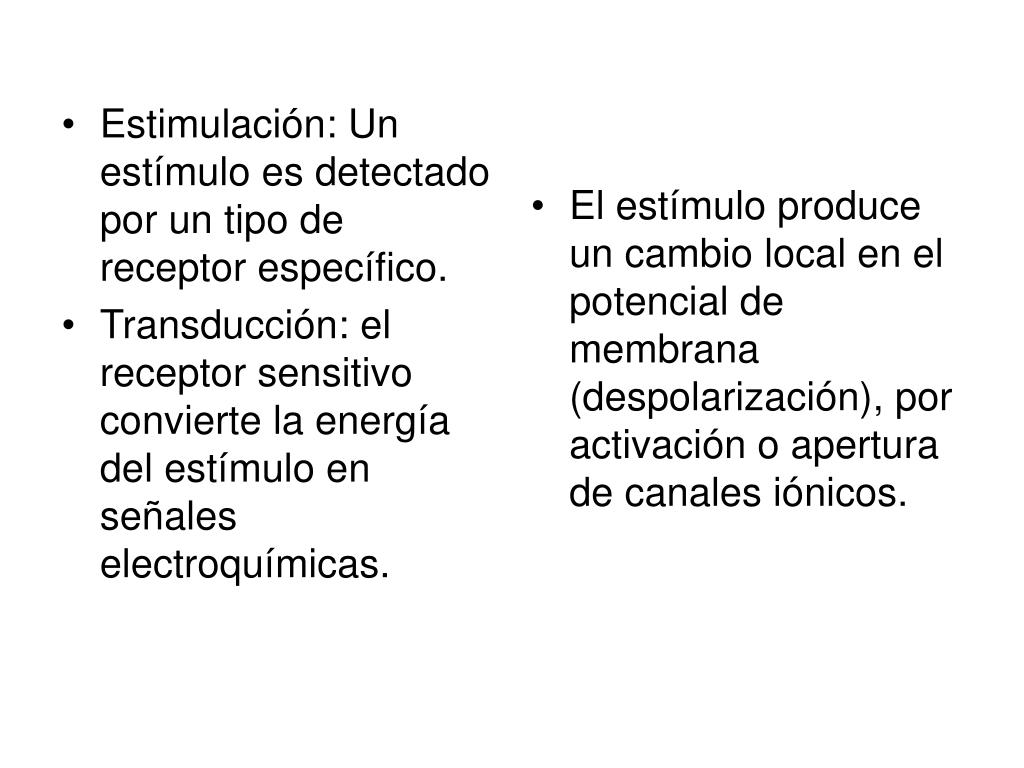 Estimulación: Un estímulo es detectado por un tipo de receptor específico. Transducción: el receptor sensitivo convierte la energía del estímulo en señales electroquímicas. El estímulo produce un cambio local en el potencial de membrana (despolarización), por activación o apertura de canales iónicos.