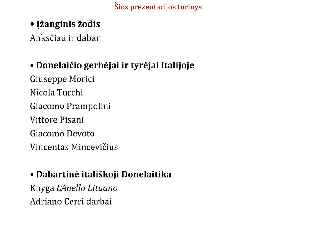 Šiosprezentacijosturinys • Įžanginis žodis Anksčiau ir dabar • DonelaičiogerbėjaiirtyrėjaiItalijoje Giuseppe Morici Nicola Turchi Giacomo Prampolini Vittore Pisani Giacomo Devoto VincentasMincevičius • DabartinėitališkojiDonelaitika KnygaL’Anello Lituano Adriano Cerri darbai