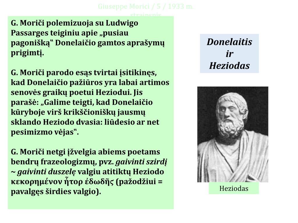 Giuseppe Morici / 5 / 1933 m. straipsnis G. Moriči polemizuoja su Ludwigo Passargesteiginiu apie „pusiau pagonišką‟ Donelaičio gamtos aprašymų prigimtį.G. Moriči parodo esąstvirtaiįsitikinęs, kadDonelaičiopažiūrosyralabaiartimossenovėsgraikųpoetuiHeziodui. Jis parašė: „Galime teigti, kad Donelaičio kūryboje virš krikščioniškų jausmų sklando Heziodo dvasia: liūdesio ar net pesimizmo vėjas‟.G. Moriči netgi įžvelgia abiems poetams bendrų frazeologizmų, pvz. gaivinti szirdį ~ gaivinti duszelę valgiu atitiktų Heziodoκεκορημένον ἦτορ ἐδωδῆϛ (pažodžiui = pavalgęs širdies valgio). Donelaitis ir Heziodas Heziodas